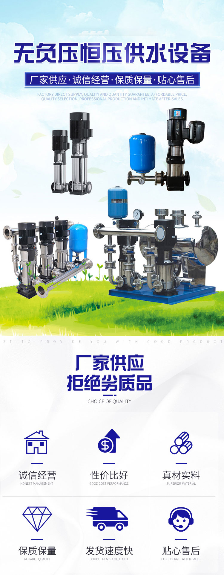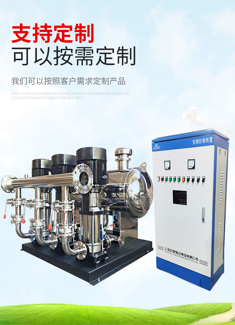 变频恒压供水设备里的水泵品牌可以根据客户的需求配置,需要配南方泵、凯泉泵、新界泵、兆源泵都可以的。除了泵外,包括变频器的品牌也可以按需配置,如:ABB变频器、汇川变频器、三晶变频器等等。